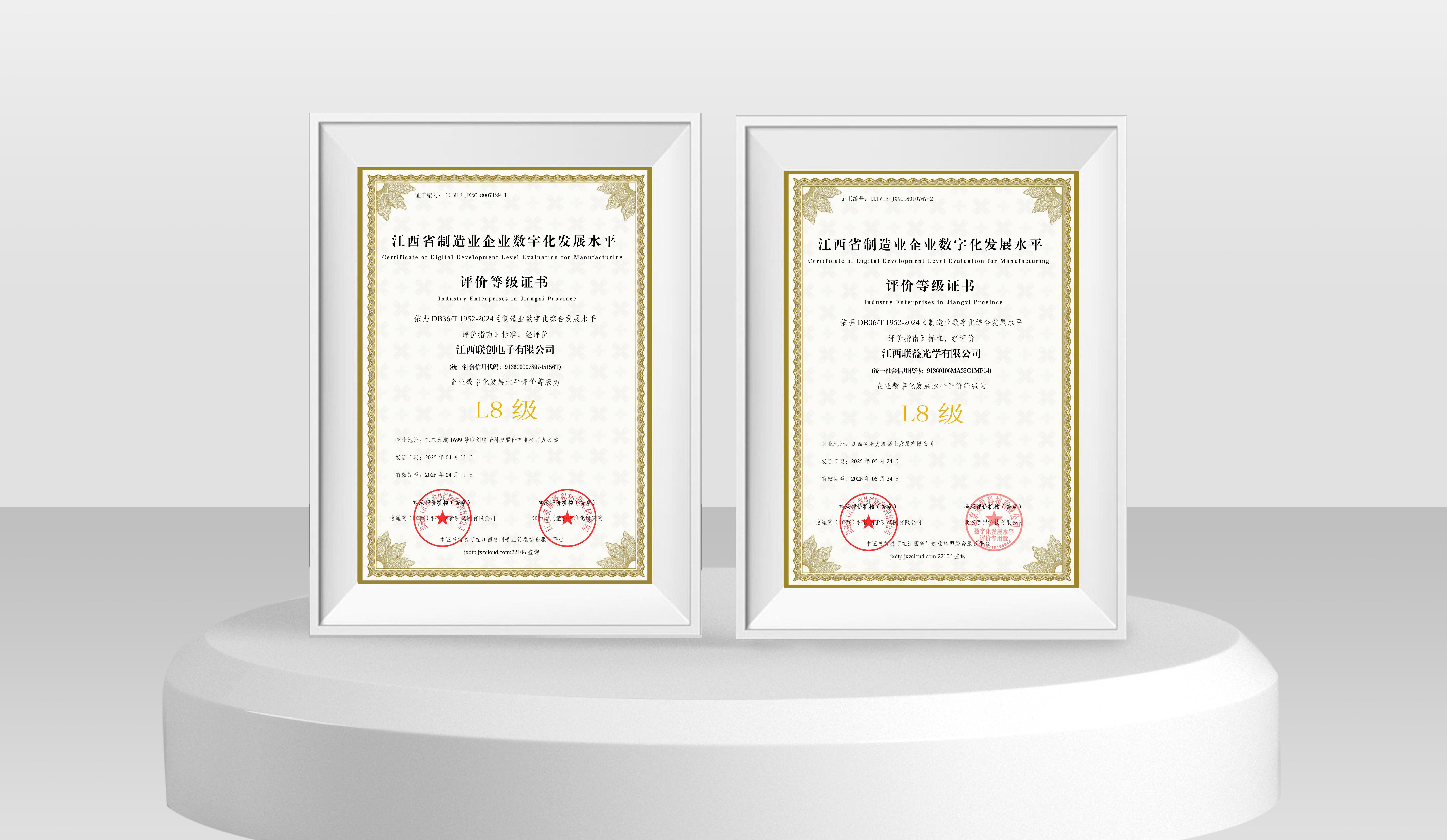 近日,联创电子科技股份有限公司旗下j9在线,j9在线(中国)(以下简称江西联创)与江西联益光学有限公司(以下简称江西联益)凭借深度集成与创新应用能力,在江西省制造业企业数字化发展水平等级评价中双双达到L8级水平,标志着两家企业在数字化转型领域已跻身全省“集成提升阶段”最高水平,为全省制造业智能化升级树立新标杆。